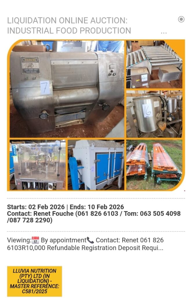 DAY 1 LIQUIDATION ONLINE AUCTION: INDUSTRIAL FOOD PRODUCTION PLANT EQUIPMENT & MORE - MEYERTON GP